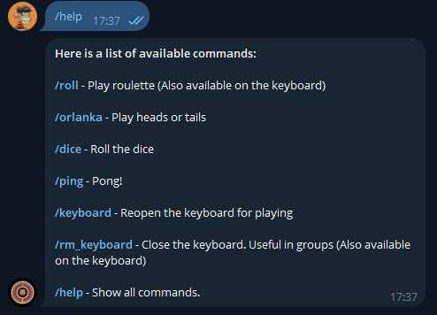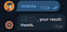 * **`/orlanka`** With this command, users can play the popular game of heads or tails on our Telegram bot. It's a simple and fun way to bet and test their luck.