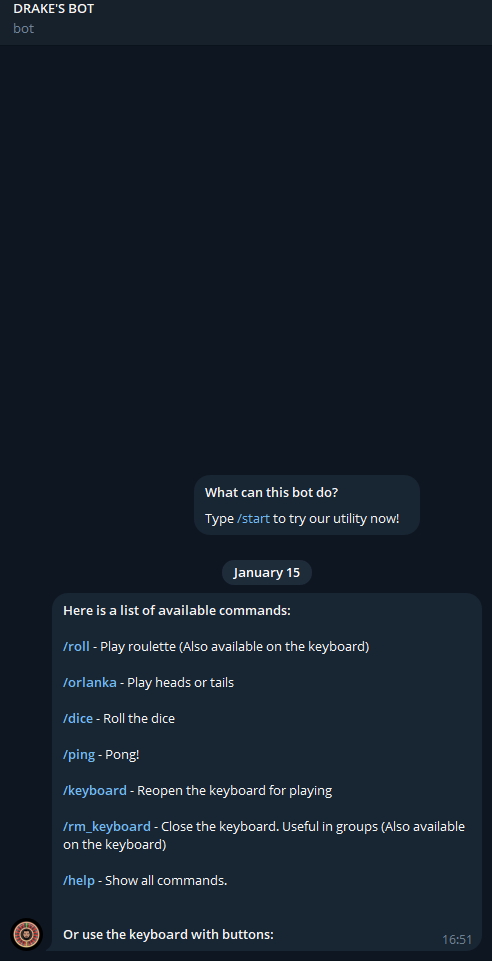* **`/rm_keyboard`** With this command, users can close the virtual keyboard on our Telegram bot if they wish. It's useful in groups to avoid message clutter and keep the conversation organized.